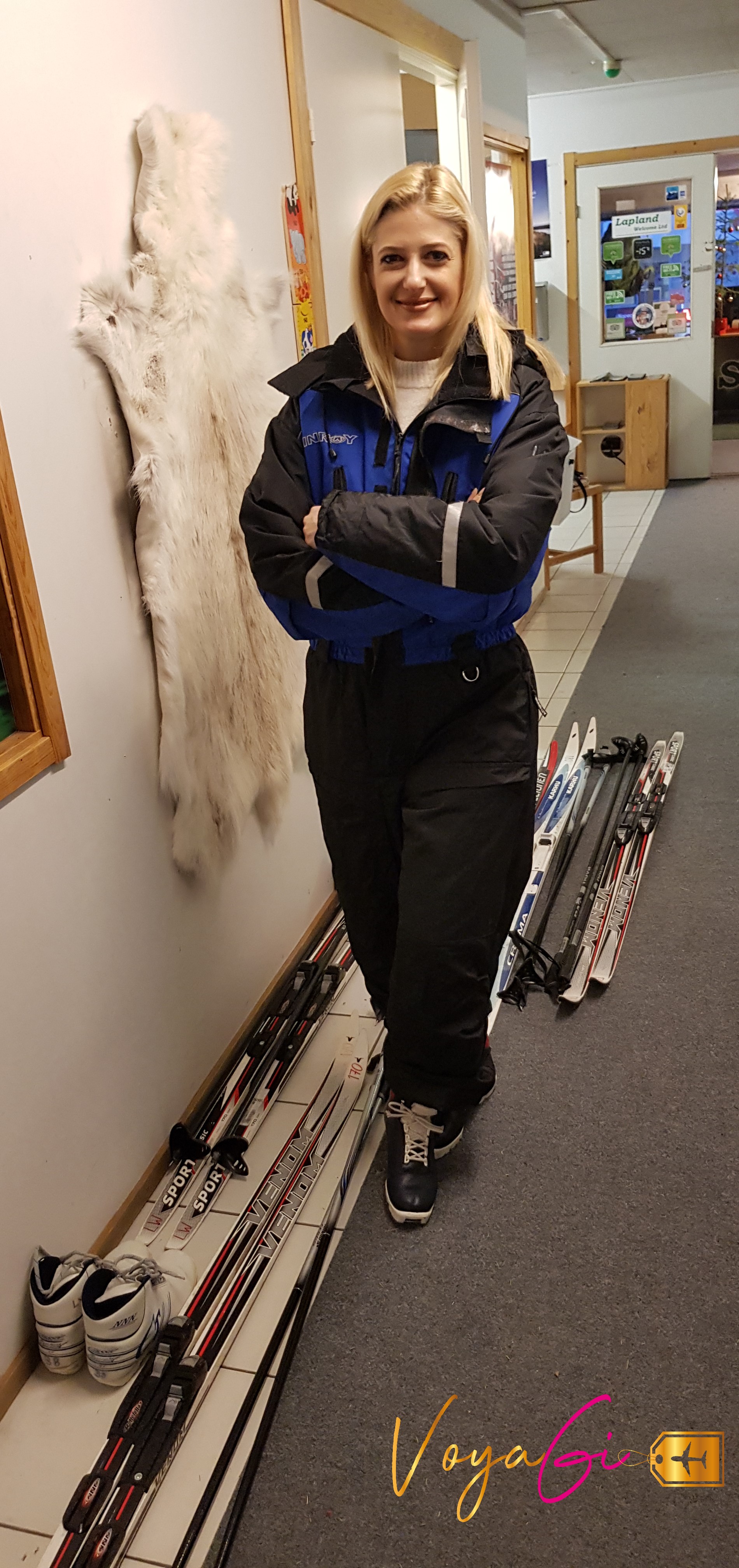 Dia 1 – Rovaniemi. Chegamos a Rovaniemi pela estação de trem super cedo, às 6h da manhã. É uma estação super pequena. Atenção: sempre converse com o Hotel ou hospedagem sobre sua chegada ou saída com uma semana de antecedência. Não é um destino muito turístico então as regras são um pouco diferentes. Sem transfer, pegamos um táxi. Havia vários que já esperavam os turistas desembarcarem do trem. Foi bem tranquilo e ele nos deixou na porta da recepção do Hotel. Eu planejei tanto essa viagem que fiz a reserva do hotel um ano antes da viagem (além da ansiedade, o hotel é bem concorrido). Tudo é como um cenário de filme. Nunca vi tanta neve na minha vida. Felizmente o hotel nos permitiu realizar o check-in cedo. Deixamos nossa bagagem, tomamos café da manhã e fomos descansar. Logo, também almoçamos no Hotel. Na parte da tarde, iniciamos a nossa primeira aventura de inverno. Se é para ver neve tem que ser de pertinho, né! Passamos praticamente a tarde toda no parque Ounasvaara praticando o Cross-Country Skiing. Compramos o passeio com a empresa Lapland Welcome. No pacote, estavam inclusos o traslado de ida e volta até o hotel, roupas e botas especiais, instrutor qualificado, lanche e bebidas quentes. Houve vários tombos, mas que valeram a pena. As paisagens eram lindas e a experiência foi muito legal.
