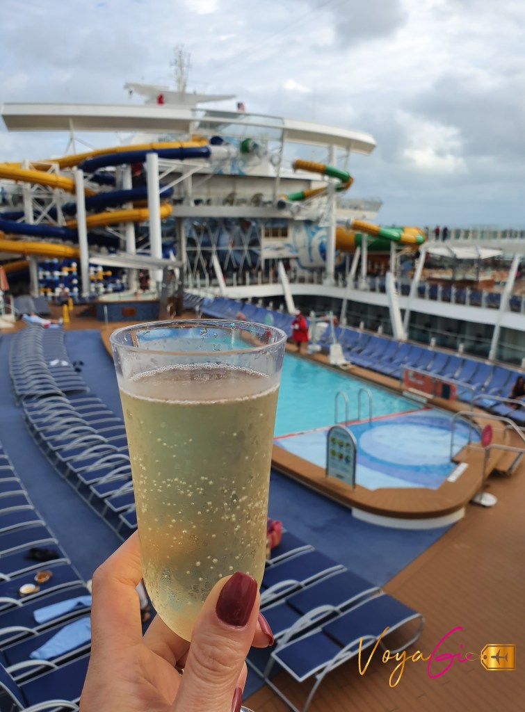 Dia 1 – Embarque no terminal Crow of Miami. Chegamos ao porto depois de passado o perrengue (post anterior) do carro locado. E, como já havíamos feito download do aplicativo da Royal Caribbean, conseguimos fazer tranquilamente o check-in pelo do aplicativo. Tudo era novidade para a debutante de Cruzeiros (eu!). Passamos rapidamente pela fila do check-in e ficamos aguardando os outros que não haviam feito o check-in pelo aplicativo. Subimos por largas escadas rolantes com um lustre central impressionante. Caminhamos um pouco, conforme a indicação dos colaboradores da empresa, e de repente já estávamos dentro navio. Ao entrar no Symphony of the Seas, eu realmente me senti um pouco perdida com tantas informações para processar logo na entrada. Passando pela passarela do terminal, chegamos na área principal do navio, a denominada Royal Promenade. A intenção é que esse local seja o coração do Navio. É como se fosse a Times Square do Cruzeiro. Todo o agito de uma rua super movimentada com lojas, restaurantes, cafeteria e o Bionic Bar, um bar automatizado. Você escolhe seu drink pelo tablet e o robô, ou melhor, o braço-robô faz para você. Antes de ir para o quarto, fomos todos almoçar no deck 16. O salão do restaurante Windjammer tem uma vista linda para as piscinas. Infelizmente não conseguimos ficar todos no mesmo deck. Eu fiquei no deck 3, cabine com vista externa, próximo ao salão das principais refeições. No quarto, recebemos boas vindas de nossa governanta e cada um ficou com um cartão, que serve como chave do quarto, cartão de embarque e também como cartão de crédito para o consumo dentro do navio. Eu gostei muito da cabine. Me senti melhor do que em um quarto desses hotéis de rede comuns. No quarto, tínhamos um cama de casal espaçosa, roupeiro, penteadeira, sofá e o banheiro. Para a saída do porto de Miami, nos reunimos no deck 16 perto da área das piscinas, cada um com uma bebida, para brindar o início de novas aventuras. Eu me senti na cena da saída do Titanic. Só que eram os passageiros de outros navios aportados que acenavam para nós. Junto à penteadeira, todos os dias, um jornal com toda a programação do navio era entregue. Descansamos um pouco e partimos para explorar o majestoso Symphony. Só deu tempo de dar uma voltinha pela Royal Promenade e parar na deck 8, chamado de Central Park, em uma joalheria que tinha um evento de relógios, onde aproveitamos a Champagne (de verdade) . Não se pode recusar esse tipo de coisa! O jantar foi no salão principal do deck 3, Main Dining Room, todos os dias, às 20h, em uma mesa já marcada. Conhecemos o nosso garçom e o seu ajudante, que ficaram conosco até o último dia de Cruzeiro. Como estávamos em 9, a mesa era só nossa! Todos dos jantares tinham entrada, prato principal e sobremesa. Eram 3 opções de cada prato. Sobre as bebidas, aguá e sucos, geralmente limonada e suco de laranja. Bebidas alcoólicas e refrigerantes eram pagos.