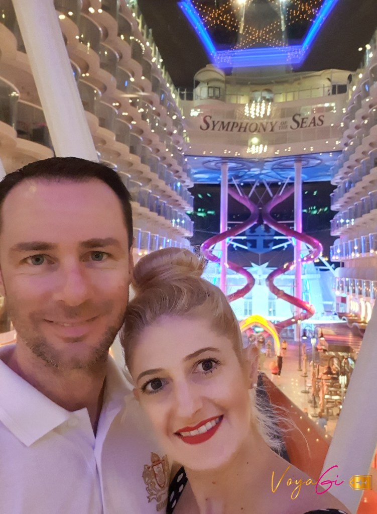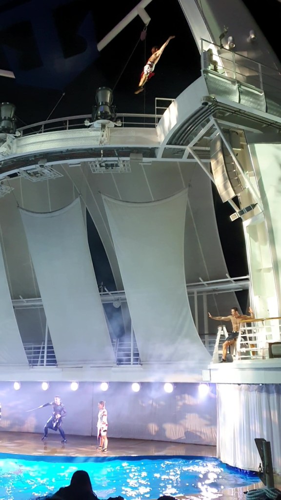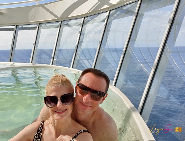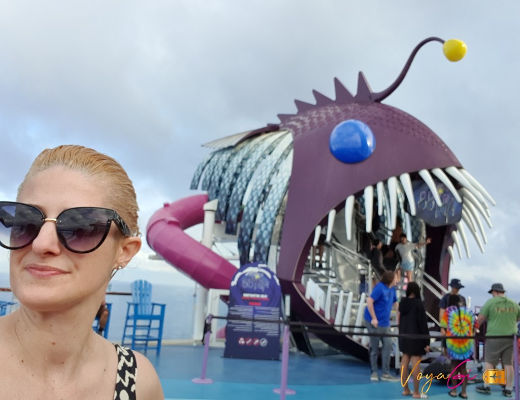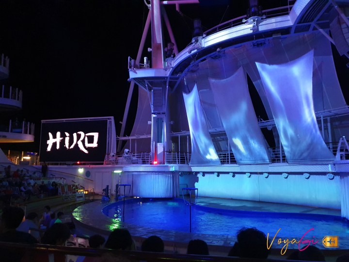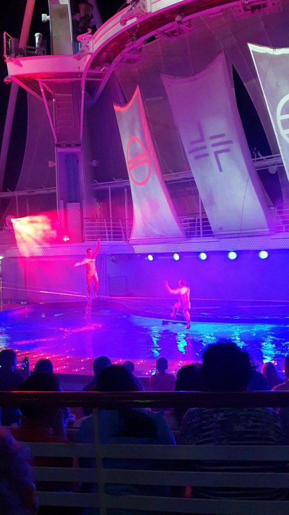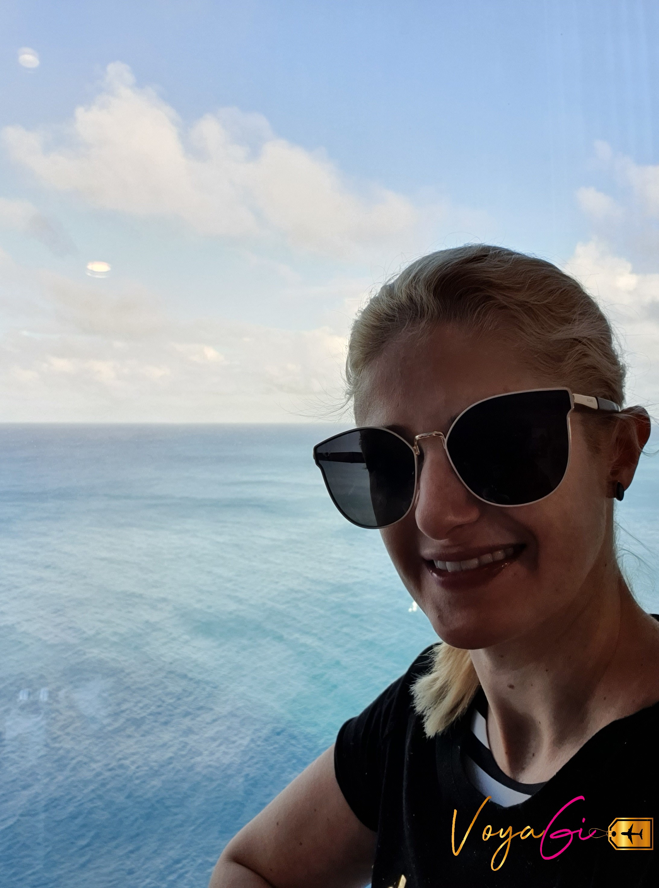 Dia 2 – Dia de navegação. Dia de aproveitar as atrações do navio. Acordamos com calma e fomos tomar café no deck 3. A fartura de comida era tanta que era muito difícil escolher só um prato para comer. Não dá para dizer que se passa fome no navio. Saímos animados e preparados para ir à academia. Sim. Acreditem nós fomos treinar dentro do navio e foi muito legal. A academia era toda equipada com os aparelhos mais modernos, toalhas para higiene pessoal e muitas esteiras com vista para o mar. Uma pequena área para a pratica de yoga e alongamento. Em outra área, tinham palestras com instrutores para os treinos. Estava lotada de pessoas a hora que fomos. Antes de iniciar nosso treino, fomos aquecer na pista de corrida do navio. Uma voltinha muito agradável pelo convés de aproximadamente 500 metros. E, é claro, com vista para o oceano. Estávamos sentindo muito falta de ir a academia. Próxima à academia, fica a área do Vitaly Spa com muitos serviços à disposição e também um salão de beleza. Satisfeitos com o treino, escolhemos novamente o salão principal do deck 3 para o almoço. Era super perto da nossa cabine e sempre tinham muitas opções de pratos. A minha parte favorita era o buffet de salada. Pasmem! O buffet ficava bem no centro do salão e tinham 2 pessoas que montavam a salada pra você. Funcionava assim: você escolhia os vegetais que queria comer e tudo era acomodado em um bowl, você podia acrescentar os molhos e sementes e um colaborador misturava tudo. Eu saia toda contente com o meu bowl até a mesa hahaha Ficava uma salada linda e saborosa. Na parte da tarde partimos para a área das piscinas para relaxar. Fomos relaxar #sqn! A primeira coisa que fizemos foi entrar na fila do trio de toboáguas, The Perfect Storm, que se entrelaçam e ficam no topo do navio. Essas coisas não são só para crianças! Na fila tinham vários adultos. O toboágua era muito legal! Vale esperar na fila. Dali partimos para uma área mais adulta. Ficamos boa parte da atarde na Jacuzzi aquecida na lateral do navio com a vista do horizonte mais linda que já vi. Realmente é uma experiencia que só o navio pode oferecer. Depois da calmaria, decidimos ir até a área de aventuras e, no caminho, paramos para pegar um sorvete na máquina. Sim, você podia pegar sorvete à vontade na máquina. Era só aguardar na fila escolher casquinha, copinho, o sabor e se servir. Passamos diversas vezes por ali. Meu marido adora sorvete, ainda mais free haha! Seguindo para a área de aventuras nesse local tinha: mini golf, tirolesa com altura de 9 decks e 25 m de distância, 2 simuladores de surf Flowrider e o maior e mais alto tobogã dos mares, o Ultimate Abyss. Fica a 47,5 metros de altura da superfície do mar. Tem uma queda de 30 metros, que é percorrida em 13 segundos. Seu circuito possui uma espiral de 450° e duas voltas de 360°. Espetacular! Na saída, encontramos meu irmão, cunhada e sobrinho no Flowrider e decidimos arriscar no surf. Foi preciso fazer inscrição para essa atração e assinar um termo de responsabilidade. Crianças precisavam de autorização dos pais. Da arquibancada, assistimos meu irmão e meu sobrinho surfar e também outras pessoas não tão habilidosas. Parecia tudo muito fácil até chegar a minha vez. Alguém aí já foi nesse simulador? A primeira tentativa a gente vai deitadinho em um tipo de prancha até a metade do simulador, conforme a orientação do instrutor. Se você conseguiu, OK. Segue para a segunda fase. Você fica em pé, claro que no meu caso com a ajuda do instrutor, em uma prancha um pouco maior. Juro que não sei até agora como consegui ficar em pé naquela prancha. A força do simulador é tão grande que eu estava com uma camiseta de manga longa, dessas com proteção solar, e quando eu caí consegui ralar todo o meu braço. Como isso aconteceu, ninguém sabe! Só sei que rimos bastante dos meus tombos. Sou dessas que tem que testar para poder dar opinião. Para a minha primeira vez, até que fui bem! hahaha Saindo dessa área, tentamos ir no Ultimate Abyss e na tirolesa, porém para ambas as atrações não podíamos estar molhados e tínhamos que estar calçados. Ficou para o outro dia. Tomamos café na Royal Promenade, encontramos lá o restante da família e, depois de um dia de muitas atrações, descansamos no quarto antes da famosa noite do Capitão. Não sei vocês, mas eu sempre ouvia falar dessa noite e achava que seria incrível jantar com o capitão. Na verdade é uma noite de gala. Todos muito arrumamos, mulheres de longo, homens de terno desfilando formosos pelo saguão principal. Nada contra haha! Fomos recepcionados na Royal Promenade com taças de espumantes. Entramos na fila para tirar foto o capitão. E esse foi o tão falado encontro. No jantar, o cardápio era especial, mas o capitão mesmo foi só para foto. Depois, corremos até o Aqua Theatre, um teatro a céu aberto em que atletas olímpicos fazem diversas acrobacias, para assistir o Show Hiro. Para essa e outras atrações temos que agendar horário pelo aplicativo do navio. A apresentação foi fantástica, apesar que eu quase ter dormido sentada de tão cansada.