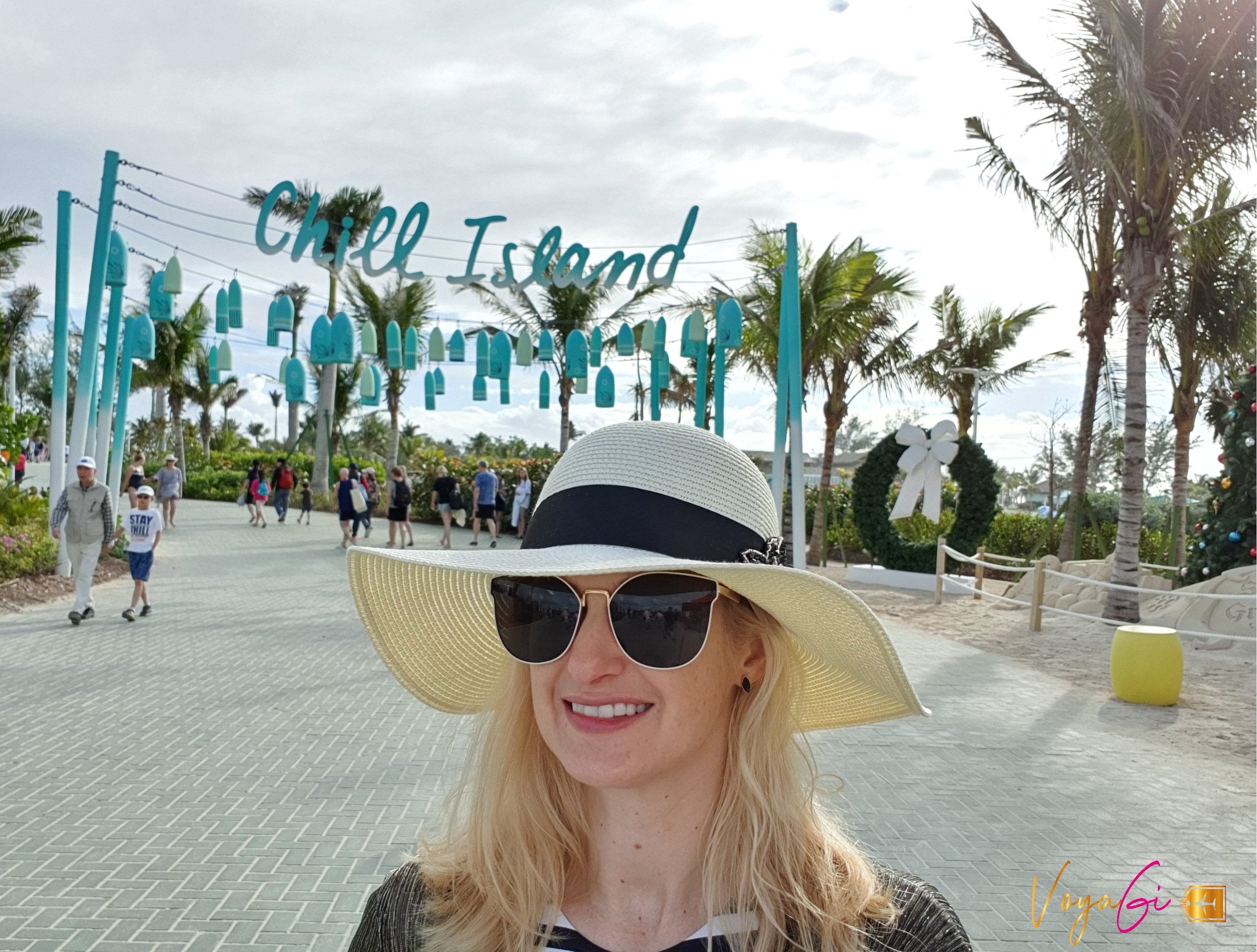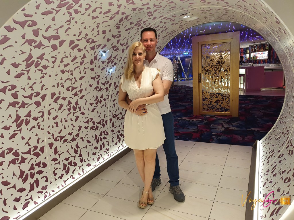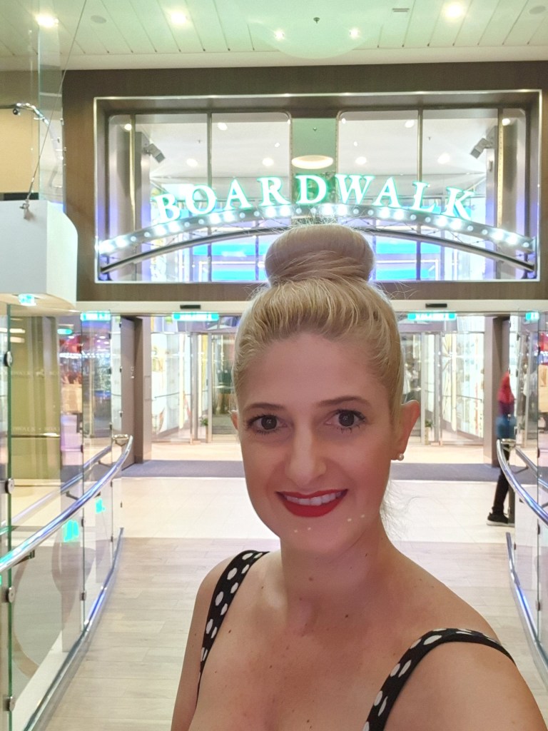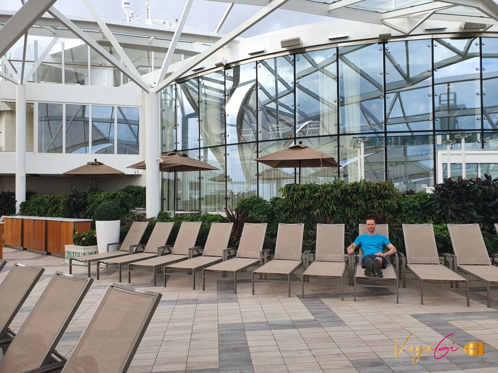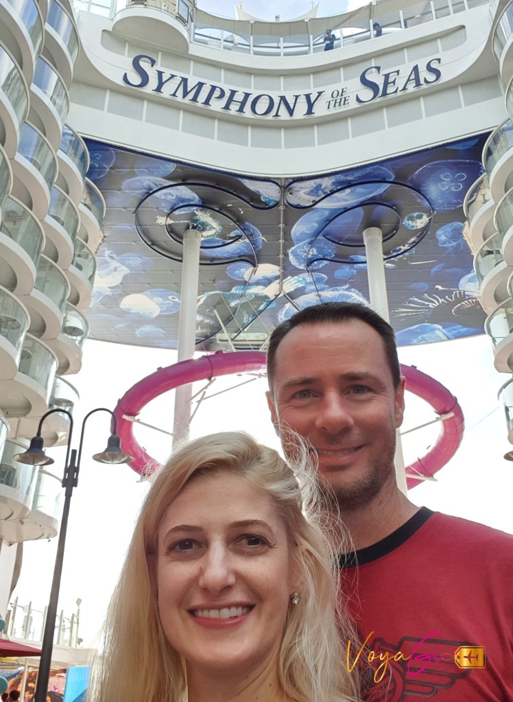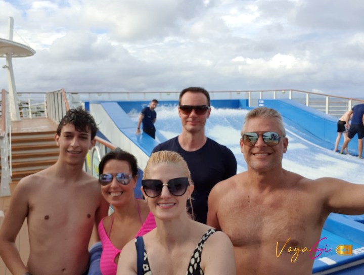 Dia 2 – Dia de navegação. Dia de aproveitar as atrações do navio. Acordamos com calma e fomos tomar café no deck 3. A fartura de comida era tanta que era muito difícil escolher só um prato para comer. Não dá para dizer que se passa fome no navio. Saímos animados e preparados para ir à academia. Sim. Acreditem nós fomos treinar dentro do navio e foi muito legal. A academia era toda equipada com os aparelhos mais modernos, toalhas para higiene pessoal e muitas esteiras com vista para o mar. Uma pequena área para a pratica de yoga e alongamento. Em outra área, tinham palestras com instrutores para os treinos. Estava lotada de pessoas a hora que fomos. Antes de iniciar nosso treino, fomos aquecer na pista de corrida do navio. Uma voltinha muito agradável pelo convés de aproximadamente 500 metros. E, é claro, com vista para o oceano. Estávamos sentindo muito falta de ir a academia. Próxima à academia, fica a área do Vitaly Spa com muitos serviços à disposição e também um salão de beleza. Satisfeitos com o treino, escolhemos novamente o salão principal do deck 3 para o almoço. Era super perto da nossa cabine e sempre tinham muitas opções de pratos. A minha parte favorita era o buffet de salada. Pasmem! O buffet ficava bem no centro do salão e tinham 2 pessoas que montavam a salada pra você. Funcionava assim: você escolhia os vegetais que queria comer e tudo era acomodado em um bowl, você podia acrescentar os molhos e sementes e um colaborador misturava tudo. Eu saia toda contente com o meu bowl até a mesa hahaha Ficava uma salada linda e saborosa. Na parte da tarde partimos para a área das piscinas para relaxar. Fomos relaxar #sqn! A primeira coisa que fizemos foi entrar na fila do trio de toboáguas, The Perfect Storm, que se entrelaçam e ficam no topo do navio. Essas coisas não são só para crianças! Na fila tinham vários adultos. O toboágua era muito legal! Vale esperar na fila. Dali partimos para uma área mais adulta. Ficamos boa parte da atarde na Jacuzzi aquecida na lateral do navio com a vista do horizonte mais linda que já vi. Realmente é uma experiencia que só o navio pode oferecer. Depois da calmaria, decidimos ir até a área de aventuras e, no caminho, paramos para pegar um sorvete na máquina. Sim, você podia pegar sorvete à vontade na máquina. Era só aguardar na fila escolher casquinha, copinho, o sabor e se servir. Passamos diversas vezes por ali. Meu marido adora sorvete, ainda mais free haha! Seguindo para a área de aventuras nesse local tinha: mini golf, tirolesa com altura de 9 decks e 25 m de distância, 2 simuladores de surf Flowrider e o maior e mais alto tobogã dos mares, o Ultimate Abyss. Fica a 47,5 metros de altura da superfície do mar. Tem uma queda de 30 metros, que é percorrida em 13 segundos. Seu circuito possui uma espiral de 450° e duas voltas de 360°. Espetacular! Na saída, encontramos meu irmão, cunhada e sobrinho no Flowrider e decidimos arriscar no surf. Foi preciso fazer inscrição para essa atração e assinar um termo de responsabilidade. Crianças precisavam de autorização dos pais. Da arquibancada, assistimos meu irmão e meu sobrinho surfar e também outras pessoas não tão habilidosas. Parecia tudo muito fácil até chegar a minha vez. Alguém aí já foi nesse simulador? A primeira tentativa a gente vai deitadinho em um tipo de prancha até a metade do simulador, conforme a orientação do instrutor. Se você conseguiu, OK. Segue para a segunda fase. Você fica em pé, claro que no meu caso com a ajuda do instrutor, em uma prancha um pouco maior. Juro que não sei até agora como consegui ficar em pé naquela prancha. A força do simulador é tão grande que eu estava com uma camiseta de manga longa, dessas com proteção solar, e quando eu caí consegui ralar todo o meu braço. Como isso aconteceu, ninguém sabe! Só sei que rimos bastante dos meus tombos. Sou dessas que tem que testar para poder dar opinião. Para a minha primeira vez, até que fui bem! hahaha Saindo dessa área, tentamos ir no Ultimate Abyss e na tirolesa, porém para ambas as atrações não podíamos estar molhados e tínhamos que estar calçados. Ficou para o outro dia. Tomamos café na Royal Promenade, encontramos lá o restante da família e, depois de um dia de muitas atrações, descansamos no quarto antes da famosa noite do Capitão. Não sei vocês, mas eu sempre ouvia falar dessa noite e achava que seria incrível jantar com o capitão. Na verdade é uma noite de gala. Todos muito arrumamos, mulheres de longo, homens de terno desfilando formosos pelo saguão principal. Nada contra haha! Fomos recepcionados na Royal Promenade com taças de espumantes. Entramos na fila para tirar foto o capitão. E esse foi o tão falado encontro. No jantar, o cardápio era especial, mas o capitão mesmo foi só para foto. Depois, corremos até o Aqua Theatre, um teatro a céu aberto em que atletas olímpicos fazem diversas acrobacias, para assistir o Show Hiro. Para essa e outras atrações temos que agendar horário pelo aplicativo do navio. A apresentação foi fantástica, apesar que eu quase ter dormido sentada de tão cansada.
