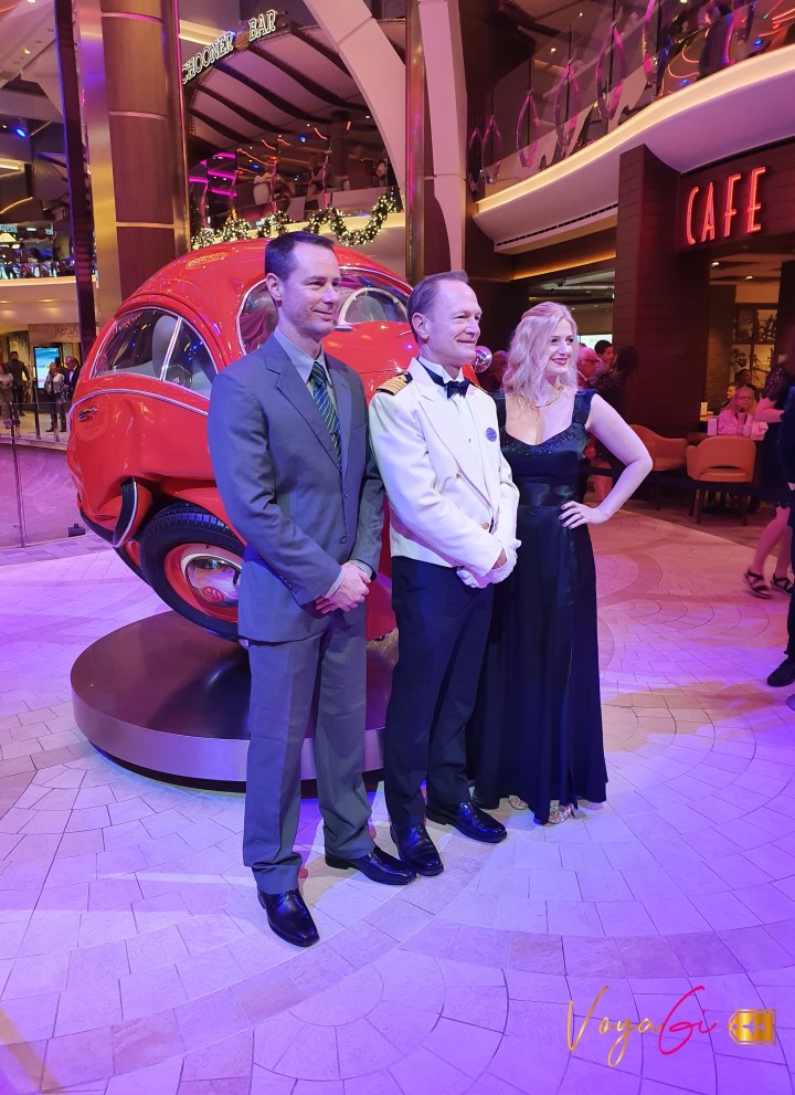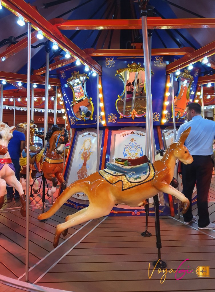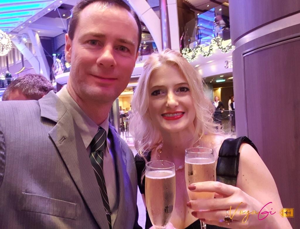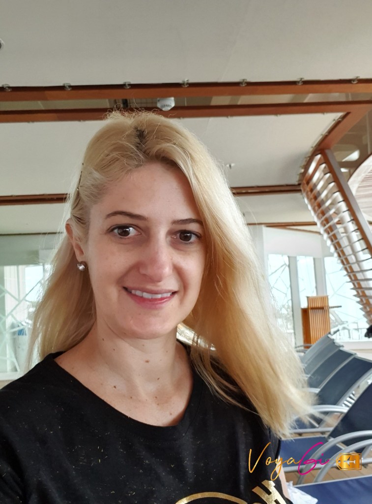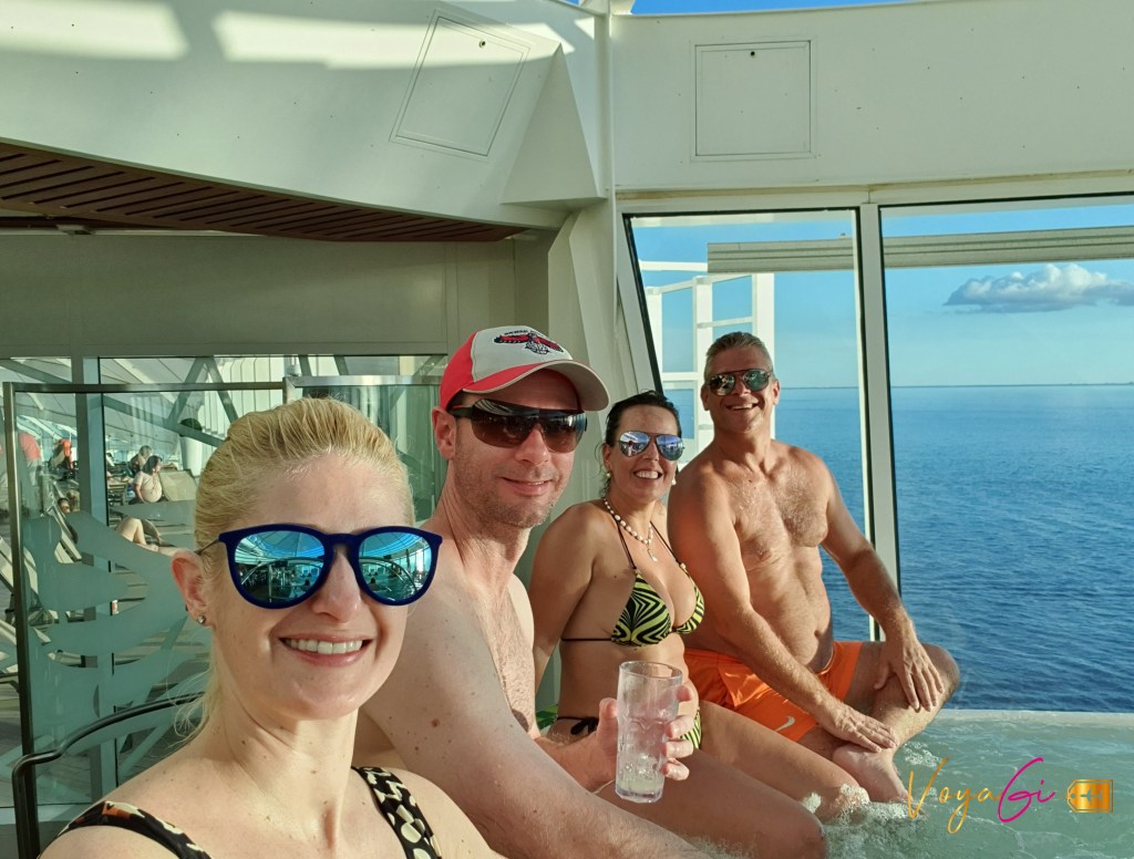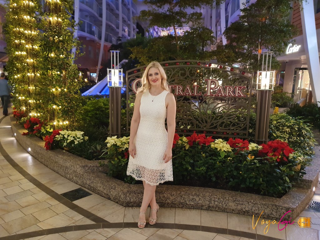Dia 2 – Dia de navegação. Dia de aproveitar as atrações do navio. Acordamos com calma e fomos tomar café no deck 3. A fartura de comida era tanta que era muito difícil escolher só um prato para comer. Não dá para dizer que se passa fome no navio. Saímos animados e preparados para ir à academia. Sim. Acreditem nós fomos treinar dentro do navio e foi muito legal. A academia era toda equipada com os aparelhos mais modernos, toalhas para higiene pessoal e muitas esteiras com vista para o mar. Uma pequena área para a pratica de yoga e alongamento. Em outra área, tinham palestras com instrutores para os treinos. Estava lotada de pessoas a hora que fomos. Antes de iniciar nosso treino, fomos aquecer na pista de corrida do navio. Uma voltinha muito agradável pelo convés de aproximadamente 500 metros. E, é claro, com vista para o oceano. Estávamos sentindo muito falta de ir a academia. Próxima à academia, fica a área do Vitaly Spa com muitos serviços à disposição e também um salão de beleza. Satisfeitos com o treino, escolhemos novamente o salão principal do deck 3 para o almoço. Era super perto da nossa cabine e sempre tinham muitas opções de pratos. A minha parte favorita era o buffet de salada. Pasmem! O buffet ficava bem no centro do salão e tinham 2 pessoas que montavam a salada pra você. Funcionava assim: você escolhia os vegetais que queria comer e tudo era acomodado em um bowl, você podia acrescentar os molhos e sementes e um colaborador misturava tudo. Eu saia toda contente com o meu bowl até a mesa hahaha Ficava uma salada linda e saborosa. Na parte da tarde partimos para a área das piscinas para relaxar. Fomos relaxar #sqn! A primeira coisa que fizemos foi entrar na fila do trio de toboáguas, The Perfect Storm, que se entrelaçam e ficam no topo do navio. Essas coisas não são só para crianças! Na fila tinham vários adultos. O toboágua era muito legal! Vale esperar na fila. Dali partimos para uma área mais adulta. Ficamos boa parte da atarde na Jacuzzi aquecida na lateral do navio com a vista do horizonte mais linda que já vi. Realmente é uma experiencia que só o navio pode oferecer. Depois da calmaria, decidimos ir até a área de aventuras e, no caminho, paramos para pegar um sorvete na máquina. Sim, você podia pegar sorvete à vontade na máquina. Era só aguardar na fila escolher casquinha, copinho, o sabor e se servir. Passamos diversas vezes por ali. Meu marido adora sorvete, ainda mais free haha! Seguindo para a área de aventuras nesse local tinha: mini golf, tirolesa com altura de 9 decks e 25 m de distância, 2 simuladores de surf Flowrider e o maior e mais alto tobogã dos mares, o Ultimate Abyss. Fica a 47,5 metros de altura da superfície do mar. Tem uma queda de 30 metros, que é percorrida em 13 segundos. Seu circuito possui uma espiral de 450° e duas voltas de 360°. Espetacular! Na saída, encontramos meu irmão, cunhada e sobrinho no Flowrider e decidimos arriscar no surf. Foi preciso fazer inscrição para essa atração e assinar um termo de responsabilidade. Crianças precisavam de autorização dos pais. Da arquibancada, assistimos meu irmão e meu sobrinho surfar e também outras pessoas não tão habilidosas. Parecia tudo muito fácil até chegar a minha vez. Alguém aí já foi nesse simulador? A primeira tentativa a gente vai deitadinho em um tipo de prancha até a metade do simulador, conforme a orientação do instrutor. Se você conseguiu, OK. Segue para a segunda fase. Você fica em pé, claro que no meu caso com a ajuda do instrutor, em uma prancha um pouco maior. Juro que não sei até agora como consegui ficar em pé naquela prancha. A força do simulador é tão grande que eu estava com uma camiseta de manga longa, dessas com proteção solar, e quando eu caí consegui ralar todo o meu braço. Como isso aconteceu, ninguém sabe! Só sei que rimos bastante dos meus tombos. Sou dessas que tem que testar para poder dar opinião. Para a minha primeira vez, até que fui bem! hahaha Saindo dessa área, tentamos ir no Ultimate Abyss e na tirolesa, porém para ambas as atrações não podíamos estar molhados e tínhamos que estar calçados. Ficou para o outro dia. Tomamos café na Royal Promenade, encontramos lá o restante da família e, depois de um dia de muitas atrações, descansamos no quarto antes da famosa noite do Capitão. Não sei vocês, mas eu sempre ouvia falar dessa noite e achava que seria incrível jantar com o capitão. Na verdade é uma noite de gala. Todos muito arrumamos, mulheres de longo, homens de terno desfilando formosos pelo saguão principal. Nada contra haha! Fomos recepcionados na Royal Promenade com taças de espumantes. Entramos na fila para tirar foto o capitão. E esse foi o tão falado encontro. No jantar, o cardápio era especial, mas o capitão mesmo foi só para foto. Depois, corremos até o Aqua Theatre, um teatro a céu aberto em que atletas olímpicos fazem diversas acrobacias, para assistir o Show Hiro. Para essa e outras atrações temos que agendar horário pelo aplicativo do navio. A apresentação foi fantástica, apesar que eu quase ter dormido sentada de tão cansada.