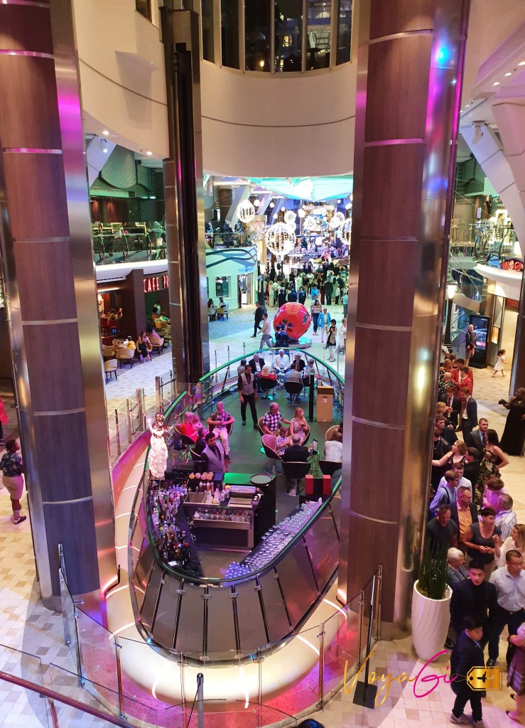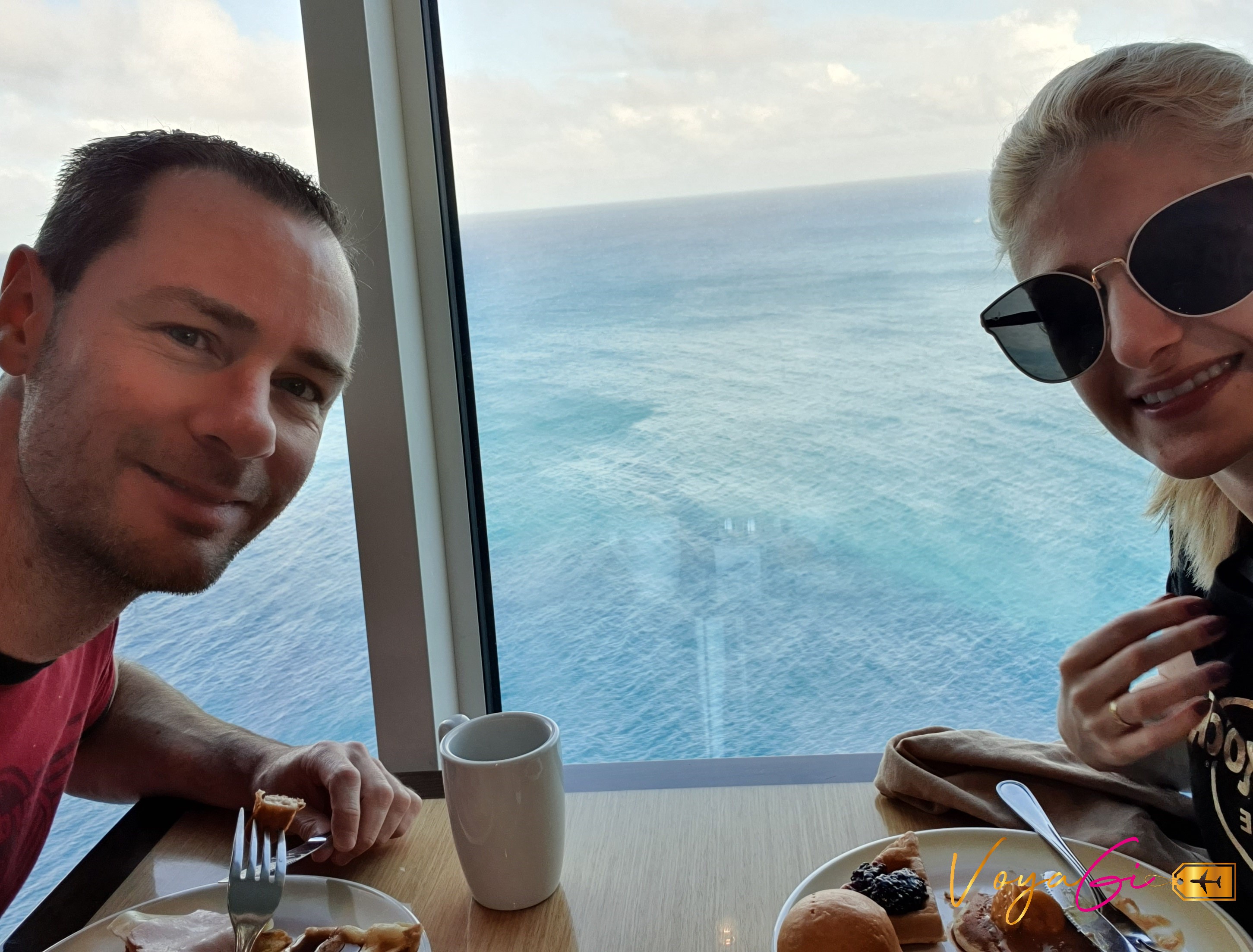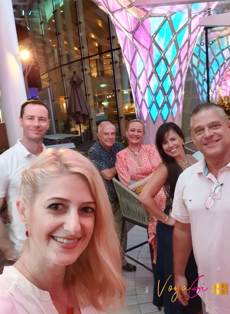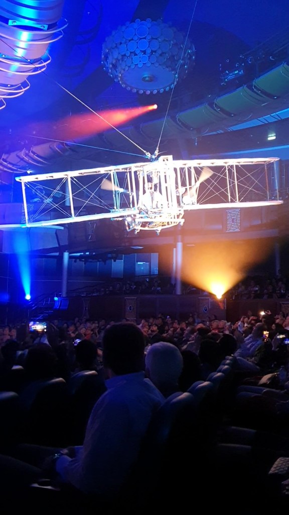 Dia 6 – Dia de navegação. Iniciando o dia com um café diferente, partimos novamente para o Solarium Bistro Restaurant. Como era dia de navegação, ou seja, passaríamos o dia todo dentro do Symphony, fizemos as coisas mais devagar. Passeamos pela Royal Promenade, entramos em todas as lojinhas, almoçamos no Windjammer e ficamos de boa só perambulando pelo navio. Como estávamos secos aproveitamos para ir no Ultimate Abyss. A entrada da atração fica tão acima no nível do mar que meu deu medo. Meu marido foi primeiro e gritou tanto que confesso que eu fiquei apavorada! Mas quando chegou a minha vez fiquei um pouco decepcionada. Foi tão rápido que nem deu tempo de sentir nada. Gostei mais do toboágua. À tarde, fomos tomar um café no Café Promenade e encontramos o pessoal por lá. Toda tarde, tinha tipo uma feirinha de mercadorias com um preço acessível na Promenade: 10 dólares. Coisas do tipo chapéus, saídas de praia, camisetas, bolsas de praia entre outros. Muitas vezes, tinha promoção de relógios de marcas famosas como Invicta, Fossil, Guess etc. Fizemos umas comprinhas básicas. Todas as despesas com compras e consumos que não estavam incluídos no pacote, foram passados no cartão que recebemos assim que chegamos no navio. Fiquei um pouco no quarto descansando e meu marido foi novamente à academia antes do jantar. Jantamos no Main Dining Room com a família. No jantar, teve uma hora de agradecimento aos colaboradores que nos serviam tão bem. Todos, chefs de cozinha, auxiliares, garçons e ajudantes, todos os envolvidos no serviços das refeiçoes entravam no salão cantando e dançando ao som de uma música animada e eram aplaudidos pelos hóspedes. Muitos levantavam os guardanapos e rodopiavam no ar como forma de agradecimento. Uma homenagem muito legal aos que nos serviram com tanta atenção e cuidado durantes os 7 dias dentro do navio. Essa noite, encontramos um músico com um piano dentro de um dos elevadores, tocando e cantando músicas que os que entravam pediam. Uma maneira divertida de entreter os que passeavam pelo navio. Fomos assistir a última atração antes de desembarcar, o musical Flight. Cheio de tecnologia e uma produção original da Royal Caribbean que contava a história da aviação. Como uma viagem no tempo, tanto o início do Show, com o balé de drones, quanto o final, com a impressionante réplica do primeiro avião sobrevoando nossas cabeças dentro no teatro, fizeram dessa apresentação a minha favorita. Apesar da nossa discordância no que diz respeito a quem inventou o avião (para nós, Santos Drumond, para eles, os irmãos Wright), foi mesmo uma atração espetacular.