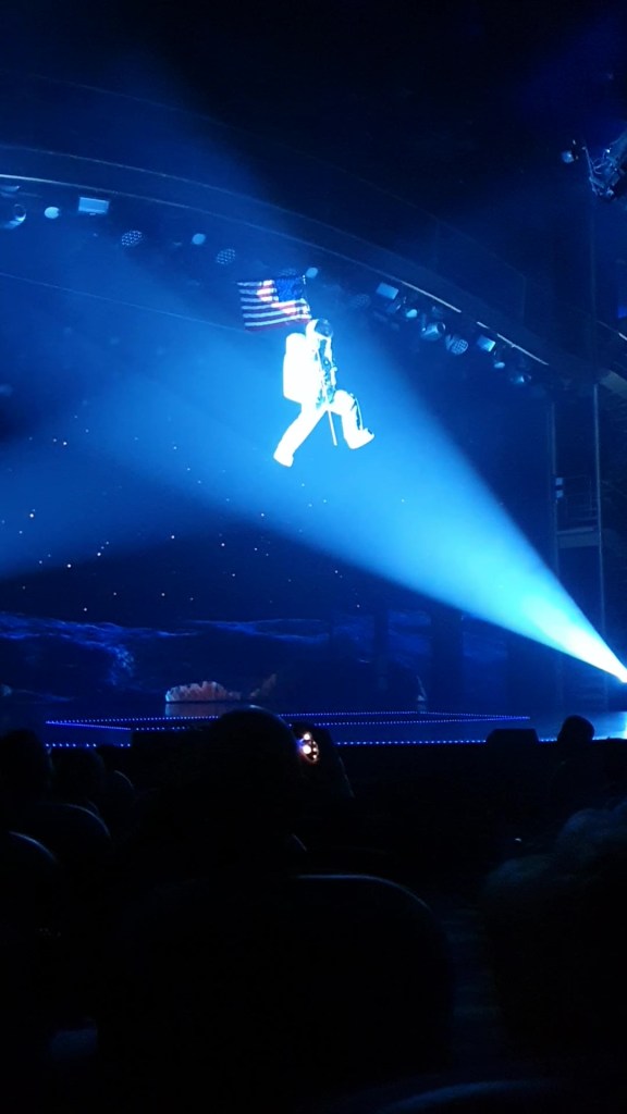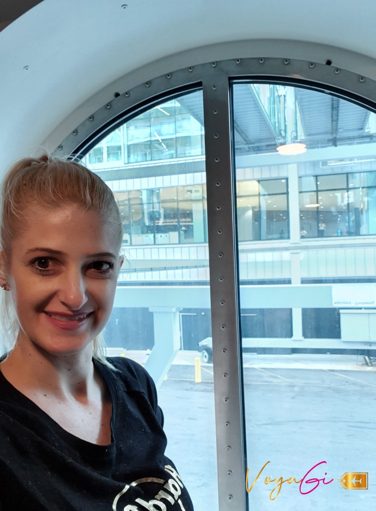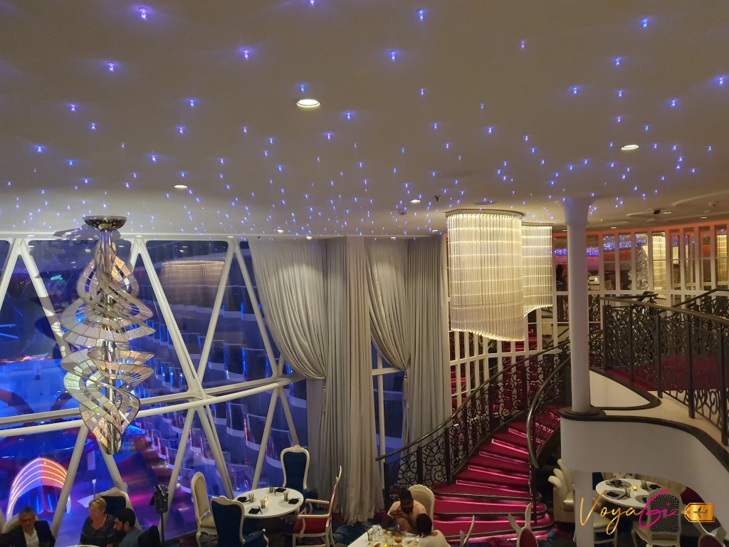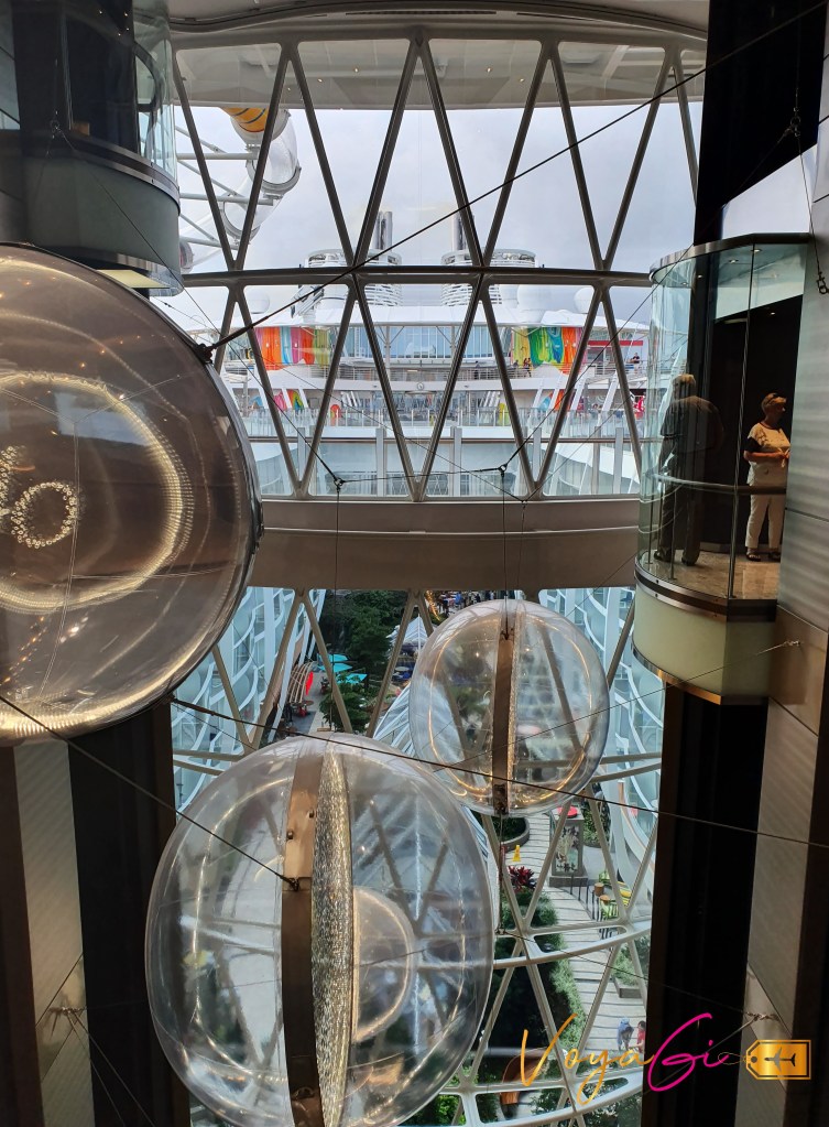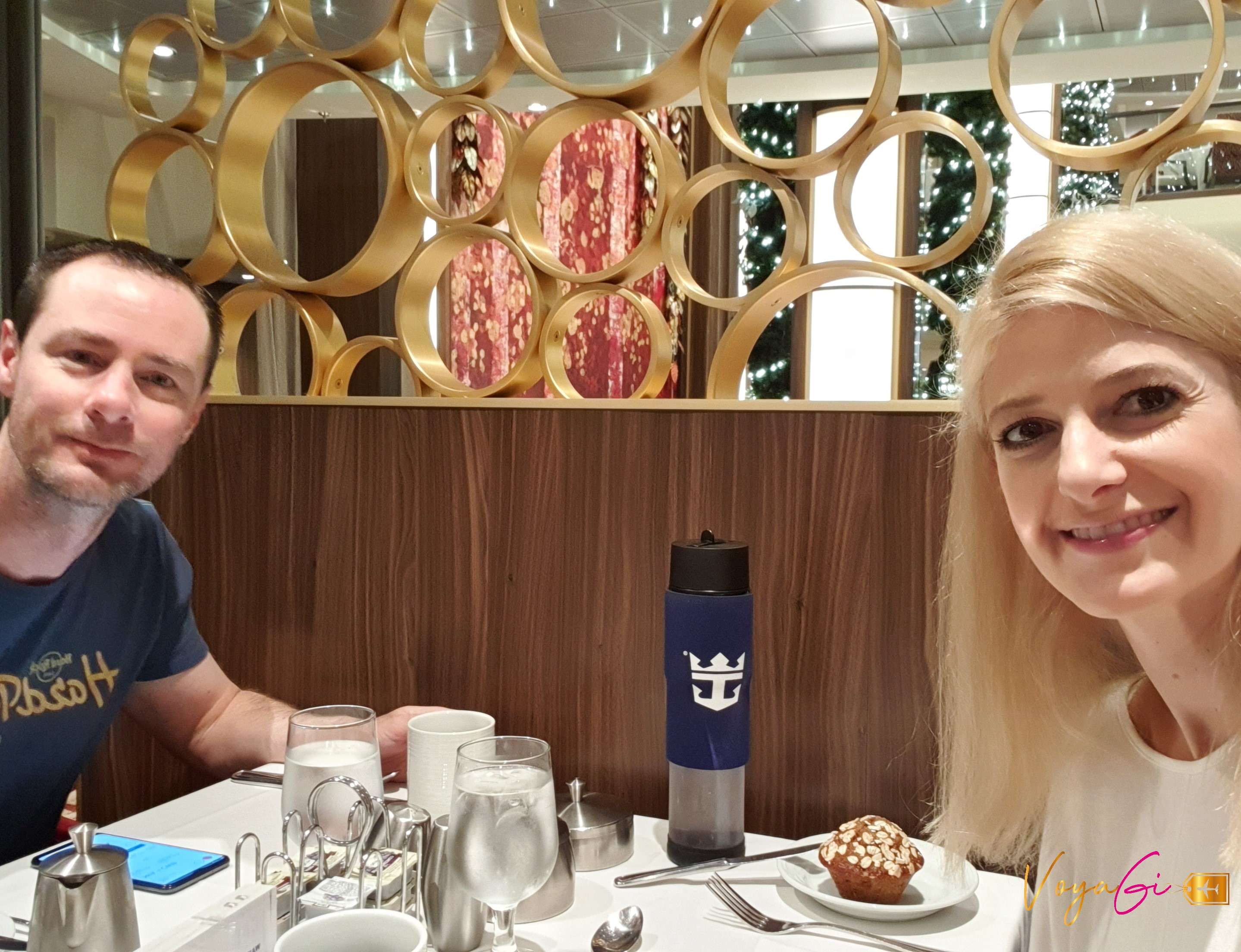 Dia 6 – Dia de navegação. Iniciando o dia com um café diferente, partimos novamente para o Solarium Bistro Restaurant. Como era dia de navegação, ou seja, passaríamos o dia todo dentro do Symphony, fizemos as coisas mais devagar. Passeamos pela Royal Promenade, entramos em todas as lojinhas, almoçamos no Windjammer e ficamos de boa só perambulando pelo navio. Como estávamos secos aproveitamos para ir no Ultimate Abyss. A entrada da atração fica tão acima no nível do mar que meu deu medo. Meu marido foi primeiro e gritou tanto que confesso que eu fiquei apavorada! Mas quando chegou a minha vez fiquei um pouco decepcionada. Foi tão rápido que nem deu tempo de sentir nada. Gostei mais do toboágua. À tarde, fomos tomar um café no Café Promenade e encontramos o pessoal por lá. Toda tarde, tinha tipo uma feirinha de mercadorias com um preço acessível na Promenade: 10 dólares. Coisas do tipo chapéus, saídas de praia, camisetas, bolsas de praia entre outros. Muitas vezes, tinha promoção de relógios de marcas famosas como Invicta, Fossil, Guess etc. Fizemos umas comprinhas básicas. Todas as despesas com compras e consumos que não estavam incluídos no pacote, foram passados no cartão que recebemos assim que chegamos no navio. Fiquei um pouco no quarto descansando e meu marido foi novamente à academia antes do jantar. Jantamos no Main Dining Room com a família. No jantar, teve uma hora de agradecimento aos colaboradores que nos serviam tão bem. Todos, chefs de cozinha, auxiliares, garçons e ajudantes, todos os envolvidos no serviços das refeiçoes entravam no salão cantando e dançando ao som de uma música animada e eram aplaudidos pelos hóspedes. Muitos levantavam os guardanapos e rodopiavam no ar como forma de agradecimento. Uma homenagem muito legal aos que nos serviram com tanta atenção e cuidado durantes os 7 dias dentro do navio. Essa noite, encontramos um músico com um piano dentro de um dos elevadores, tocando e cantando músicas que os que entravam pediam. Uma maneira divertida de entreter os que passeavam pelo navio. Fomos assistir a última atração antes de desembarcar, o musical Flight. Cheio de tecnologia e uma produção original da Royal Caribbean que contava a história da aviação. Como uma viagem no tempo, tanto o início do Show, com o balé de drones, quanto o final, com a impressionante réplica do primeiro avião sobrevoando nossas cabeças dentro no teatro, fizeram dessa apresentação a minha favorita. Apesar da nossa discordância no que diz respeito a quem inventou o avião (para nós, Santos Drumond, para eles, os irmãos Wright), foi mesmo uma atração espetacular.