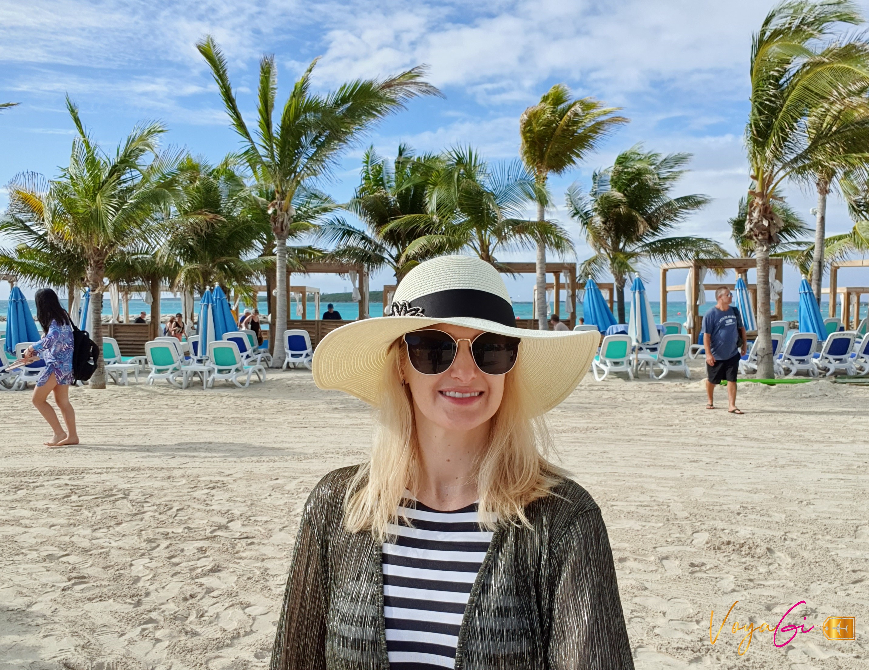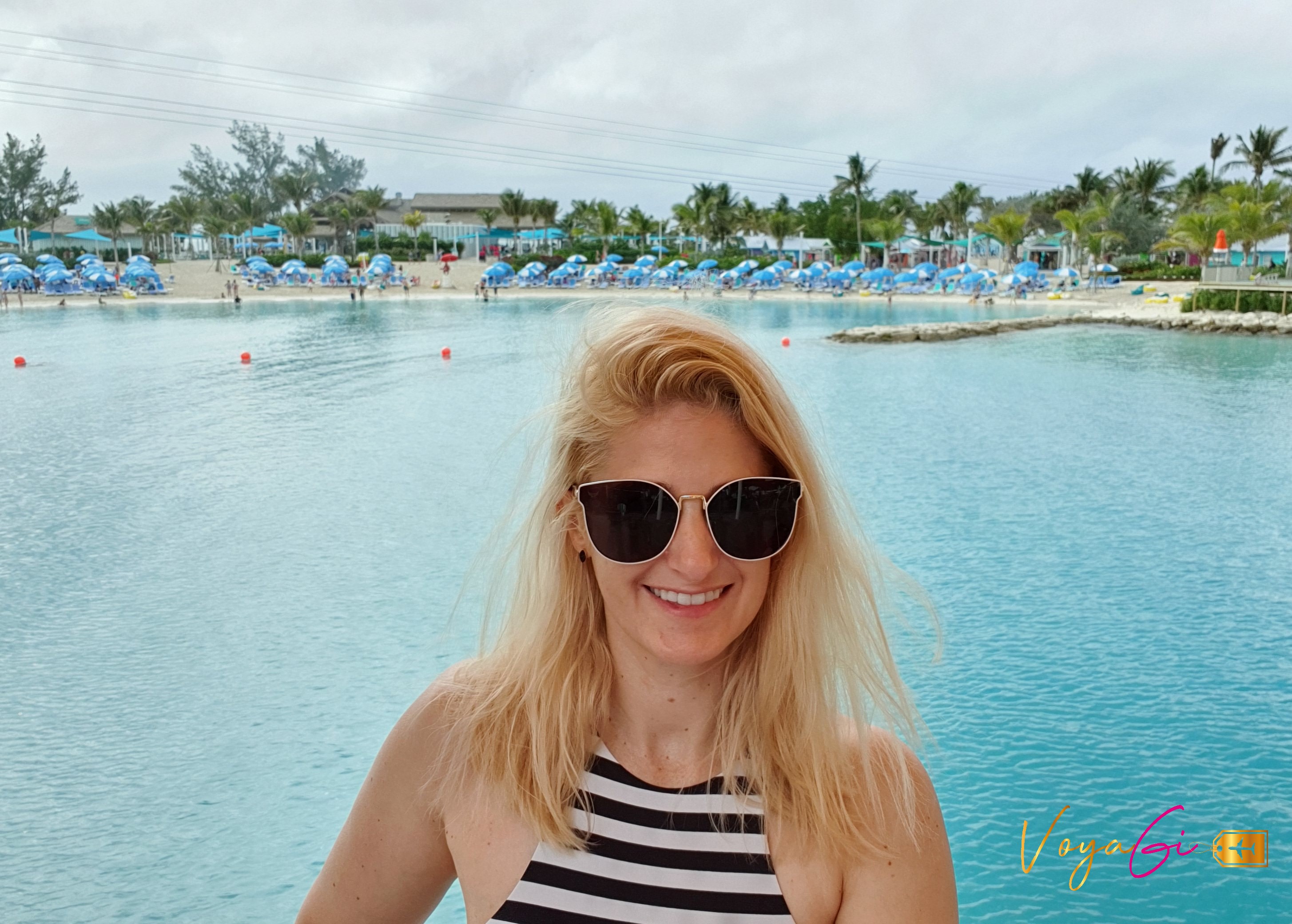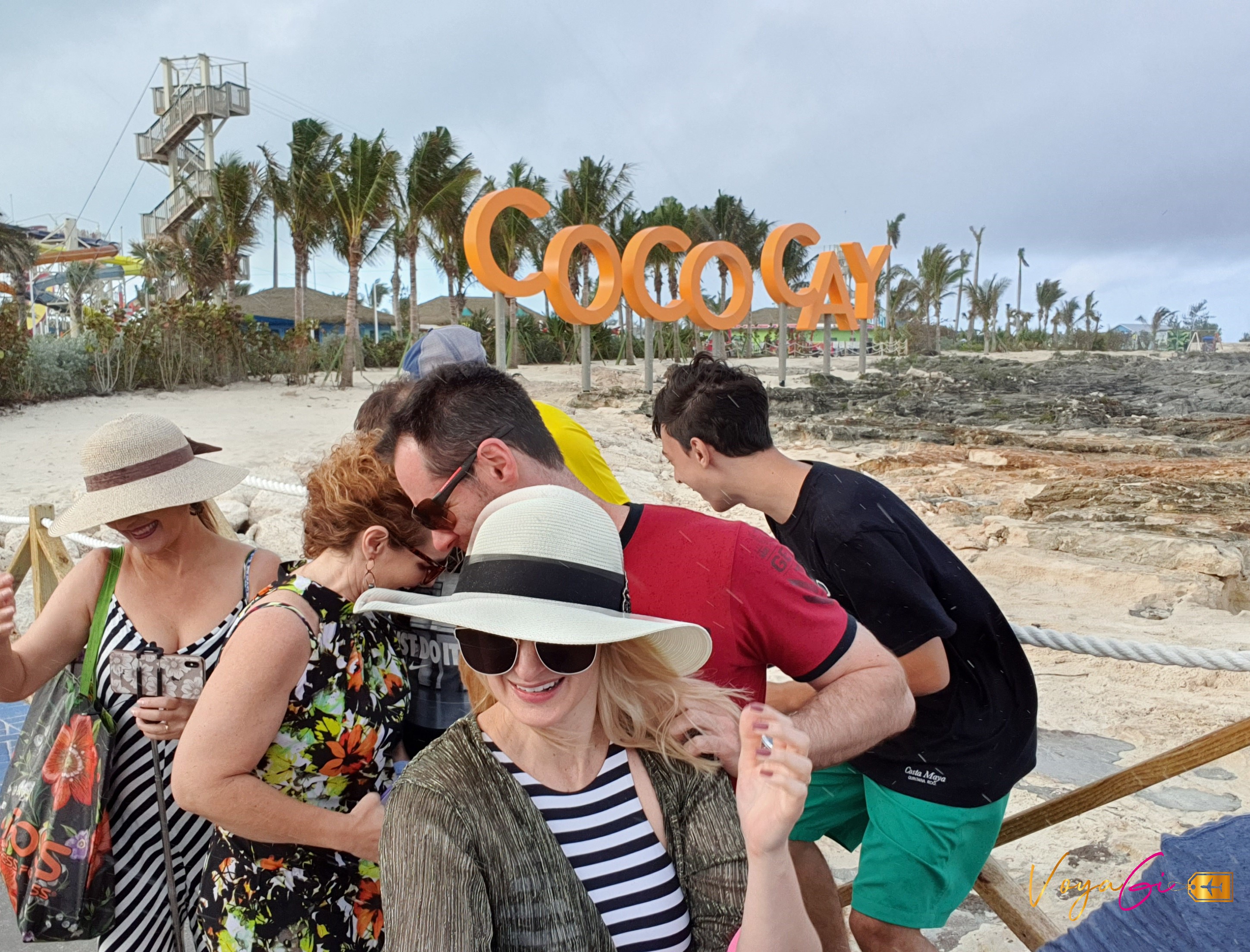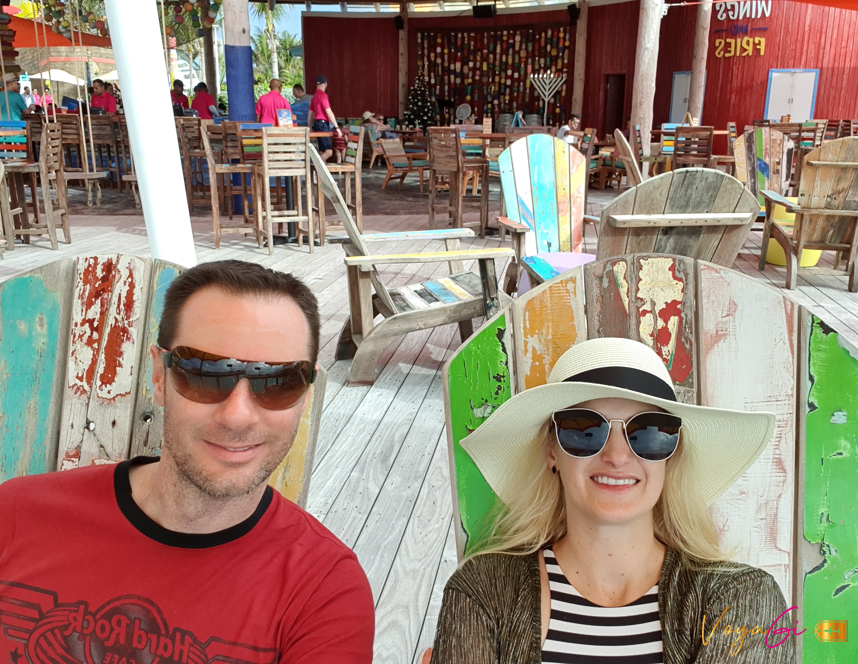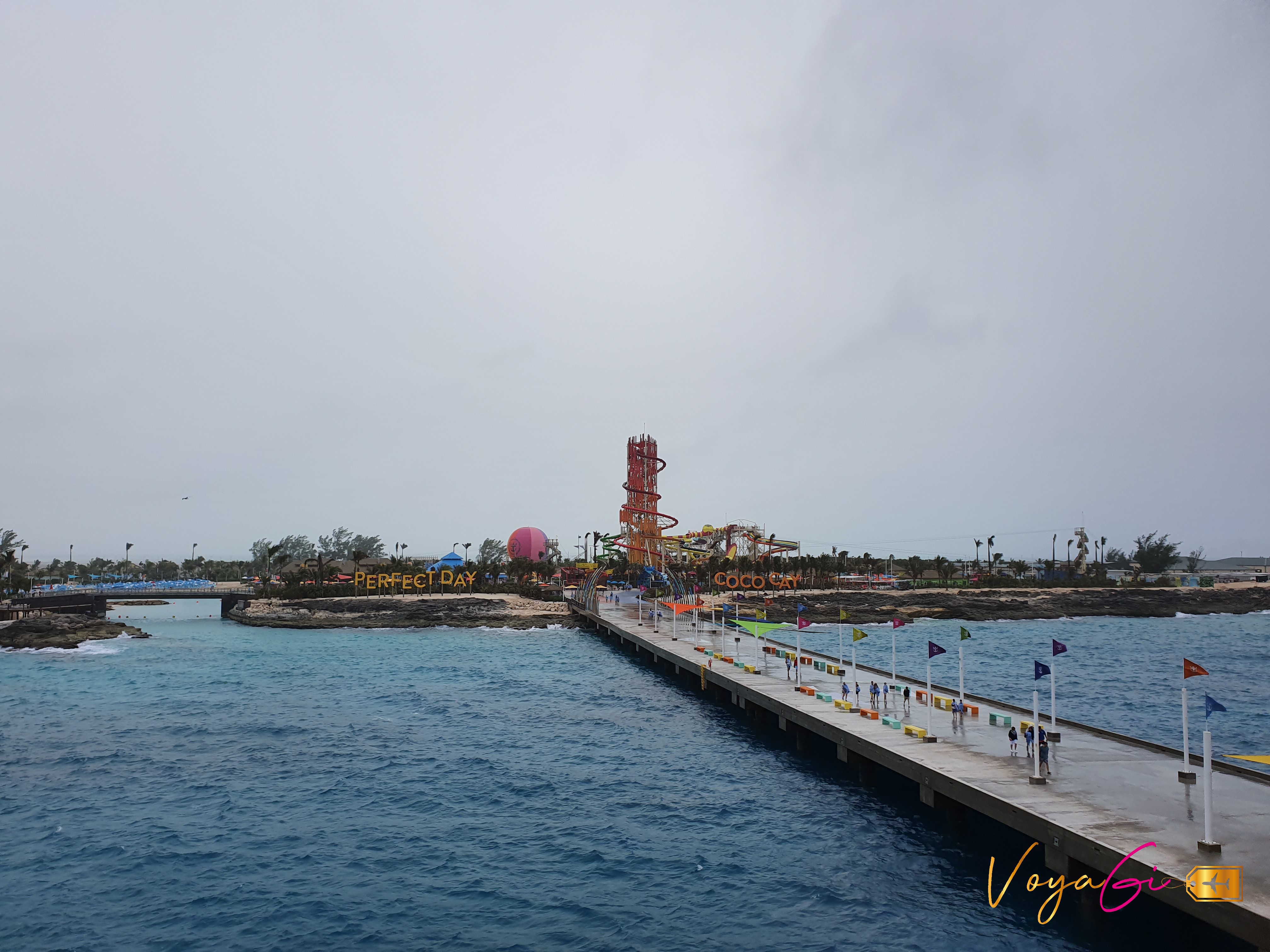 Dia 7 – Parada Perfect Day Cocoay, Bahamas. Último dia de curtir o cruzeiro e as férias com a família. Tomamos café no Windjammer com a linda vista para a ilha. Ah, quase esqueci de contar. Na saída do restaurante, tinha uma linda escadaria pintada como se fossem teclas de piano. Cada um que pisava na escada fazia com que tocasse uma nota de uma música clássica! Super legal. Voltando a Cococay, é uma ilha privativa da Royal Caribbean, exclusiva para passageiros dos cruzeiros oferecidos pela empresa. Do navio, já avistávamos a linda cor esverdeada do oceano. Chegamos com aquela animação para tirar “trocentas” fotos, quando então… começou a chover. A corrida foi boa para achar um teto para se abrigar da chuva. Logo que a chuva parou, continuamos o passeio. Na entrada, você visualiza um grande mapa indicando as atrações do local. De um lado, as belas 4 praias existentes na ilha: Snorkel Beach, a Water Sports Beach, a Coconut Willie’s Beach e a Barefoot Beach, todas disponíveis para você pegar uma cadeira para chamar de sua e desfrutar da paisagem. Do outro lado, o parque aquático pago, Thrill Waterpark, com muitas atrações como toboáguas e a maior piscina de ondas artificiais do Caribe. A infraestrutura da ilha é bem parecida com a do navio. Tem música, comida e bebida liberada por diversas partes da ilha, cadeiras, espreguiçadeiras, redes e banheiros, tudo organizado e limpo. Desembarcamos do navio com a intenção de descansar à beira-mar. Pegamos um trenzinho gratuito próprio da ilhas, fomos até a praia, Chill Island, e nos instalamos em umas espreguiçadeiras não muito longe do restaurante. Eu e meu marido decidimos caminhar um pouco para explorar a ilha e assim fizemos. Passeamos pela The Straw Market super colorida com suas muitas lojinhas simpáticas. Caminhamos mais um pouquinho e acabamos parando num bar, Capitan Jack’s , em frente o que me parecia uma praia artificial, Harbor Beach. Foi a nossa sorte ter saído da praia, eis que começou a chover tanto que não dava para enxergar a praia. Dali para frente, o tempo permaneceu ruim, ou seja, não deu para aproveitar tudo de melhor que a ilha oferecia. Retornamos para o navio para almoçar tranquilamente. Passamos o dia passeando pelo navio e arrumando a mala para o retorno para casa. Definimos não despachar a nossa bagagem, significando que nós mesmo desceríamos do navio com ela e recebemos um horário para o nosso desembarque na manhã seguinte, o que nos economizou tempo e estresse no dia seguinte.