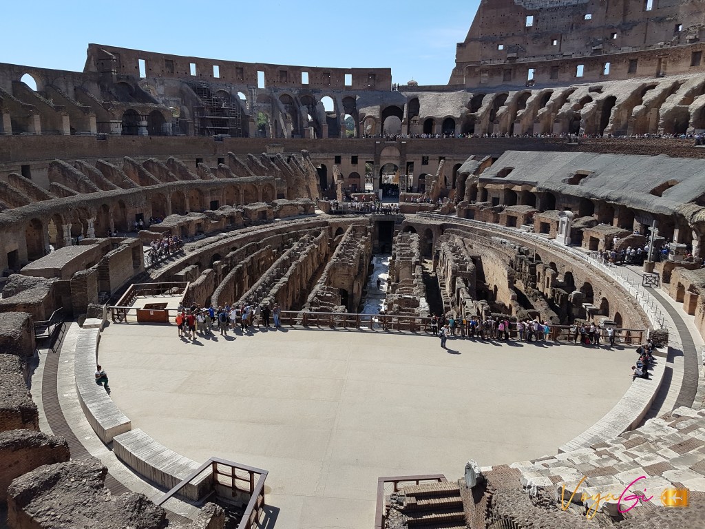 Dia 1 – Chegada em Roma. Depois de uma manhã agitada, de muita felicidade e de ter o melhor almoço da vida, escolhi os passeios que estavam abertos na segunda-feira para não perder tempo e fui de noiva mesmo! (só troquei o sapato). Como foi uma surpresa, o casamento, eu havia planejado um roteiro para a nossa primeira tarde em Roma. Sim… eu fui passear após todas as emoções! (não sei até agora como consegui aguentar de pé!) A primeira parada foi o imponente Colosseo (Coliseu). A principal ou a mais conhecida atração de Roma. É considerado o maior anfiteatro do mundo um dos grandes exemplos da arquitetura Romana. É um verdadeiro espetáculo. Saindo do Coliseu fomos caminhando até o que um dia foi o centro de Roma, Palatino e Fori Romani. Conta a história que os irmãos Rômulo e Remo nasceram no Palatino e que depois que Rômulo matou Remo fundou Roma! Será? Só sei que é um lindo museu a céu aberto. Para quem gosta de história pode tranquilamente passa horas e se perder por todas aquelas lindas ruínas. Você consegue imaginar como era naquela época todas as coisas que aconteciam nesses lugares tão importantes? Comprei o Roma Pass e essas atrações já estavam incluídas.
