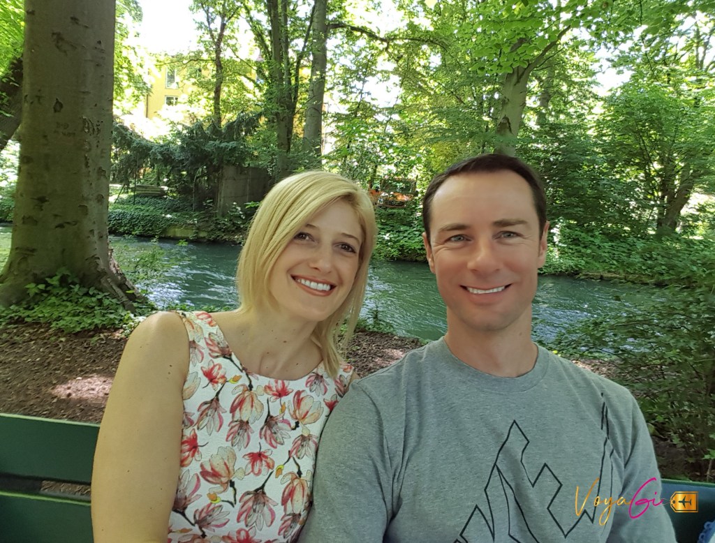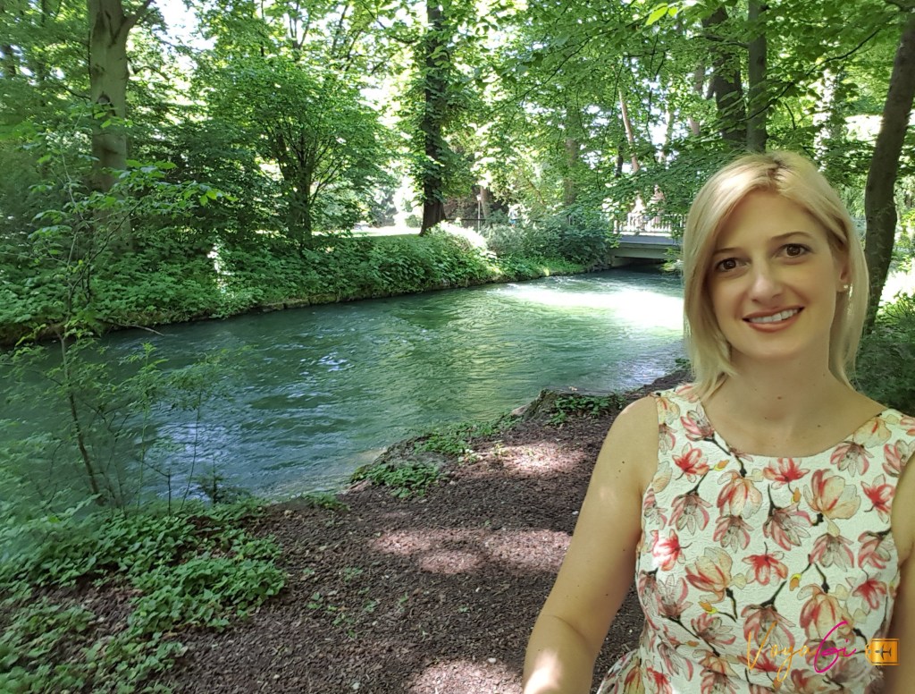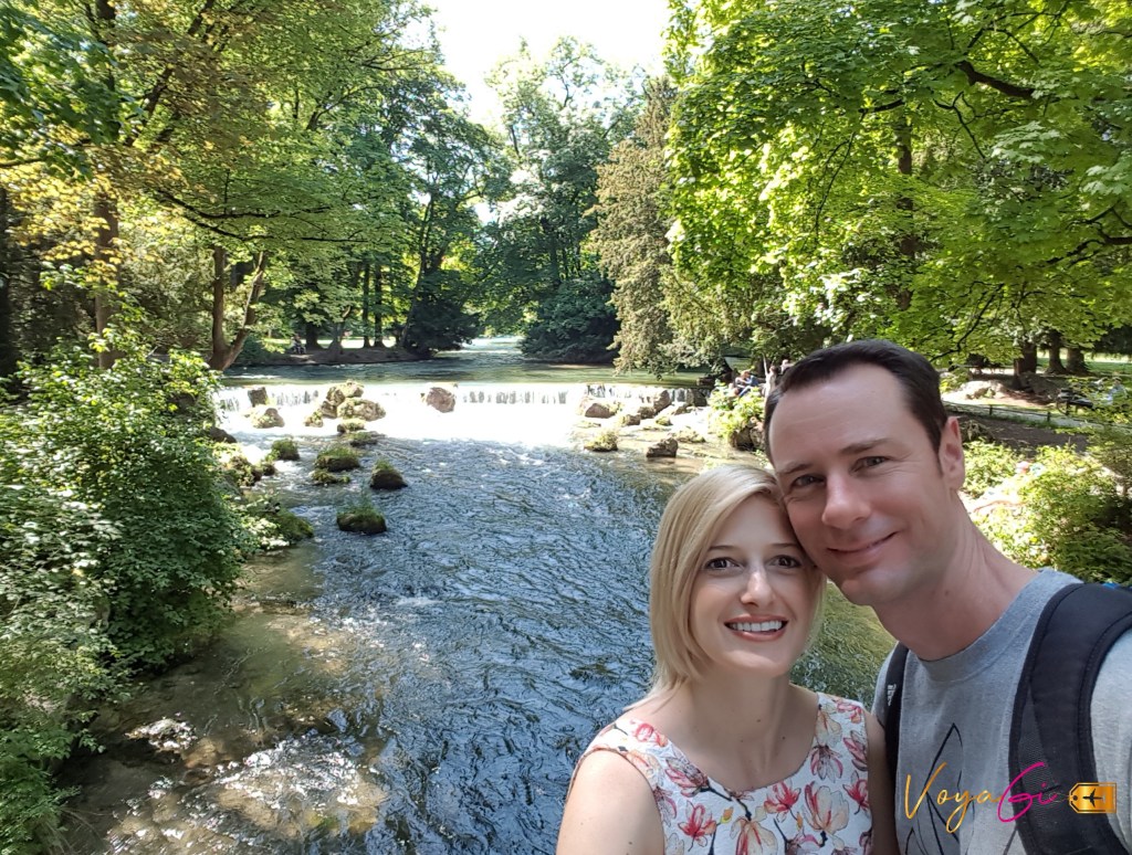 Dia 3 – Munique. Num lindo dia ensolarado, iniciamos um passeio pelo Jardim Inglês, em alemão Englischer Garten. É um dos maiores parques urbanos do mundo! Pasmem, supera o Central Park, em Nova York. Ele fica no coração de Munique e tem mais de 400 hectares de área verde. O parque oferece 2 Biergarten, várias zonas de jardins e inúmeras atividades como trilhas para caminhadas, ciclistas e corredores (são 78km), campos recreativos de futebol, quadras de tênis e vôlei. Tudo muito agradável aos olhos e ao coração. O parque é cortado por um grande canal artificial, Eisbach, e em uma parte do canal existe um degrau no fundo, fazendo com que a força da água gere uma onda permanente. Isso mesmo que você leu! Ali tem ondas artificiais que possibilitam a prática do surf. Encontramos surfistas fazendo fila e realizando manobras cada um na sua vez. (veja o vídeo no meu Instagram). independente da estão do ano eles estão por ali. É muito show! Eu posso afirmar para vocês que esse é o parque mais bonito que visitei. Saindo do Englischer Garten, caminhamos até outro jardim, o Hofgarten, para ver o Templo de Diana que fica no centro do jardim. Trata-se de um pavilhão de 1615 do qual saem diferentes caminhos que percorrem o jardim. Passando pela Max-JosephPlatz vimos o Teatro Nacional de Munique com sua linda fachada adornados com esculturas dos Leões da Baviera. De um lado a Igreja dos Teatinos e do outro o Palácio Residenz de Munique. Uma rápida parada para apreciar o original strudel e seguimos para a Igreja Peterskirche. Lá subimos os 300 degraus de uma estreita escadaria até a torre para ter uma vista de cima da cidade. Quero registrar que eu me senti tão insegura lá em cima que mal apreciei a vista. Passeamos novamente pelo Viktualienmarkt e paramos para tomar um sorvete. Dali corremos para Marienplatz para assistir o Glockenspiel (espetáculo do carrilhão de sinos). Finalizamos o dia na cervejaria Augustiner-Bräu. É a cervejaria mais antiga de Munique datada do ano de 1328. Experimentei o popular Breztel. Delícia!