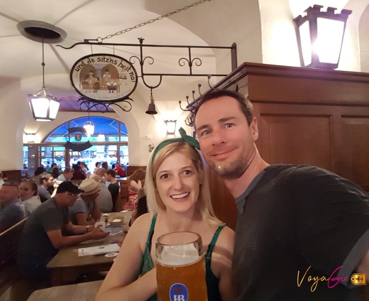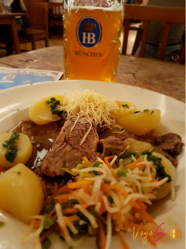 Dia 6 – Munique. Nosso último dia em Munique havíamos planejado ir até Salszburg, na Áustria para conhecer o famoso Ninho da Águia. Infelizmente o planejamento não foi adequado e perdemos o dia do passeio. Mas o dia não foi perdido, é claro. Fomos almoçar em um restaurante local próximo ao nosso apartamento, para provar comida típica e foi uma experiencia muito legal. Apesar de a senhora que nos serviu não falar uma palavra em inglês, conseguimos pedir pratos muito saborosos. Depois passeamos pelo quarteirão, fizemos comprinhas na loja de conveniências DM e fomos arrumar as malas para o próximo destino. A noite ainda deu tempo de ir até a tradicional cervejaria Löwenbräu para provar a cerveja com salsichas e batatinhas.