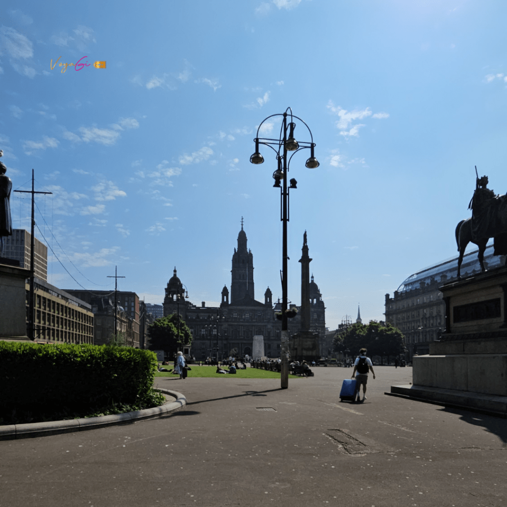 Caminhando a partir da Buchanan Street até a próxima atração esbarrei na George Square. A praça tem seu nome em homenagem ao Rei George III e abriga o grandioso palácio Glasgow City Chambers. No centro da praça podemos avistar uma coluna com 28 metros de altura que presta homenagem ao renomado autor Walter Scott.