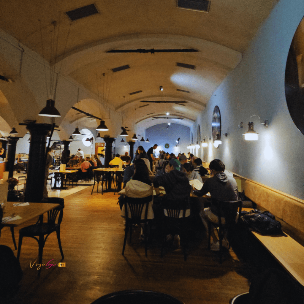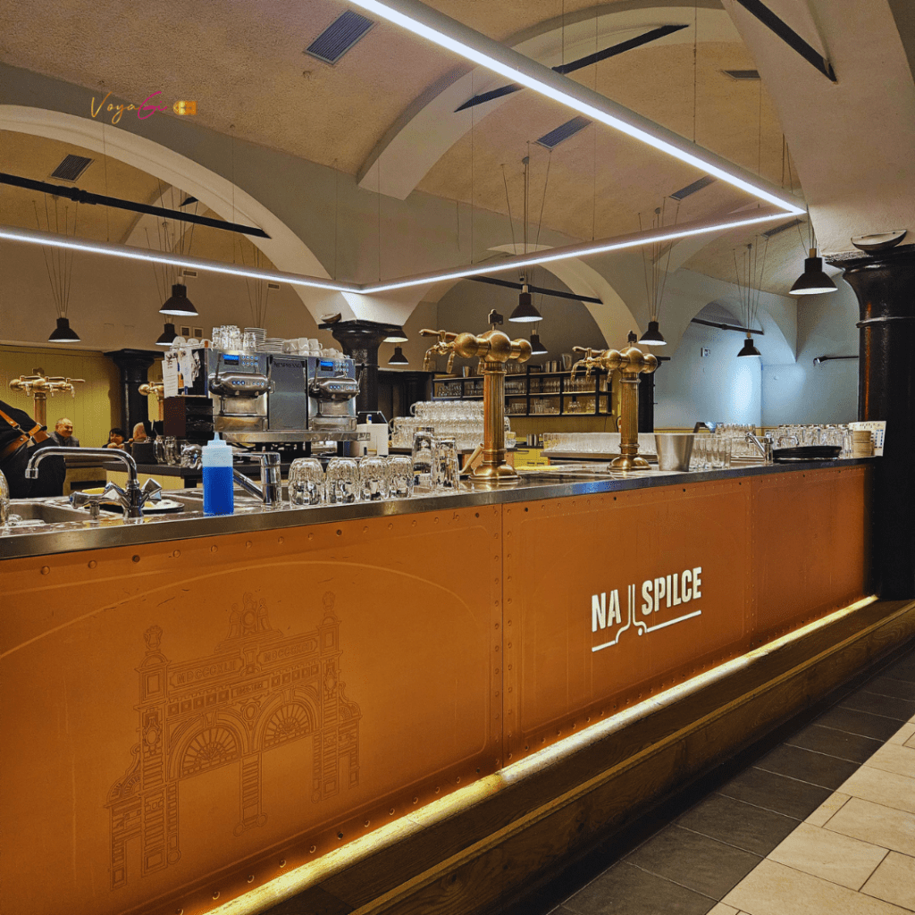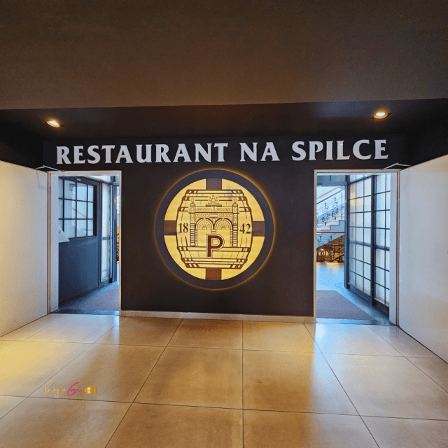 Dentro desse vasto complexo está o Restaurant Na Spilce. Instalado em um antigo salão de fermentação, o espaço preserva a atmosfera de séculos de história cervejeira. O teto alto e abobadado, as paredes robustas e o ambiente amplo parecem ecoar memórias de barris e mestres cervejeiros. Sentar-se ali é como mergulhar em uma celebração viva: o aroma do malte se mistura ao burburinho alegre das mesas, e cada prato servido acompanha a promessa de uma cerveja fresca, dourada e vibrante.