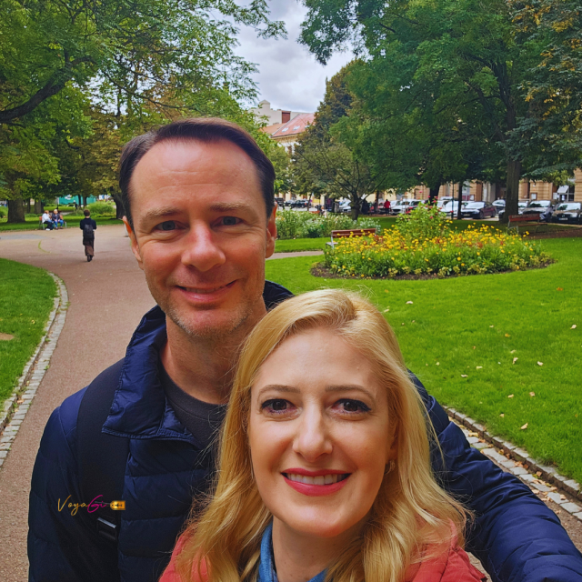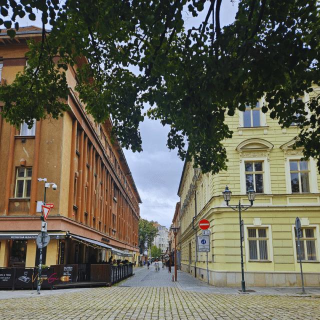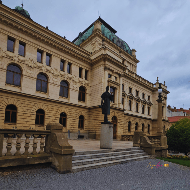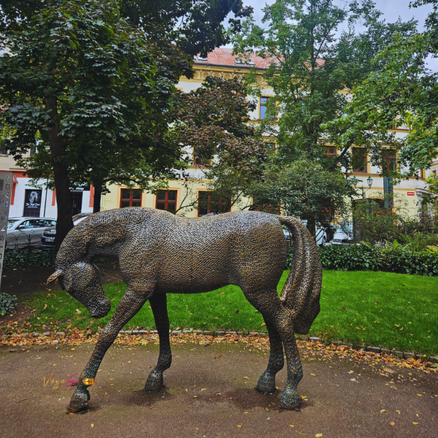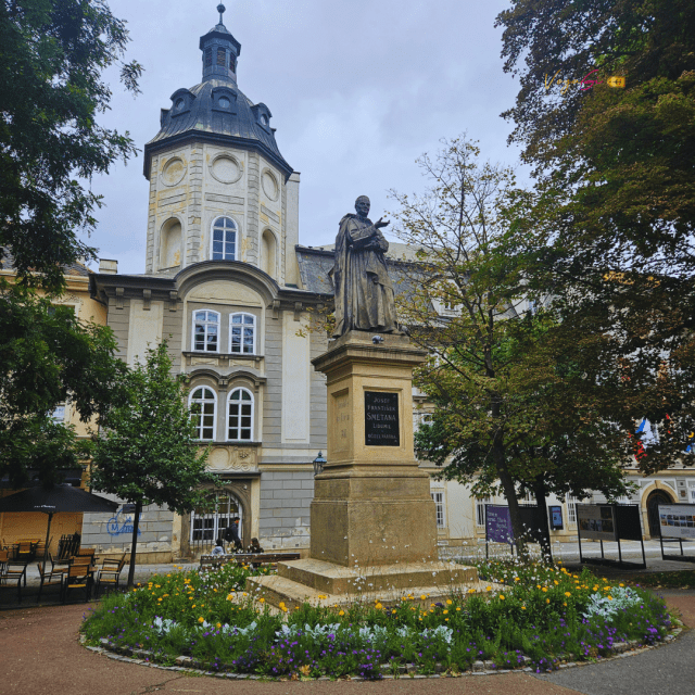 A viagem durou aproximadamente uma hora e meia. Ao chegarmos a Plzeň, a cidade nos recebeu com ruas tranquilas e fachadas que guardam séculos de história. Caminhando a partir da estação de ônibus, seguimos por um parque encantador de cidade do interior — o Kopeckého sady, no coração da cidade — desses lugares que parecem suspender o tempo e convidar à contemplação.