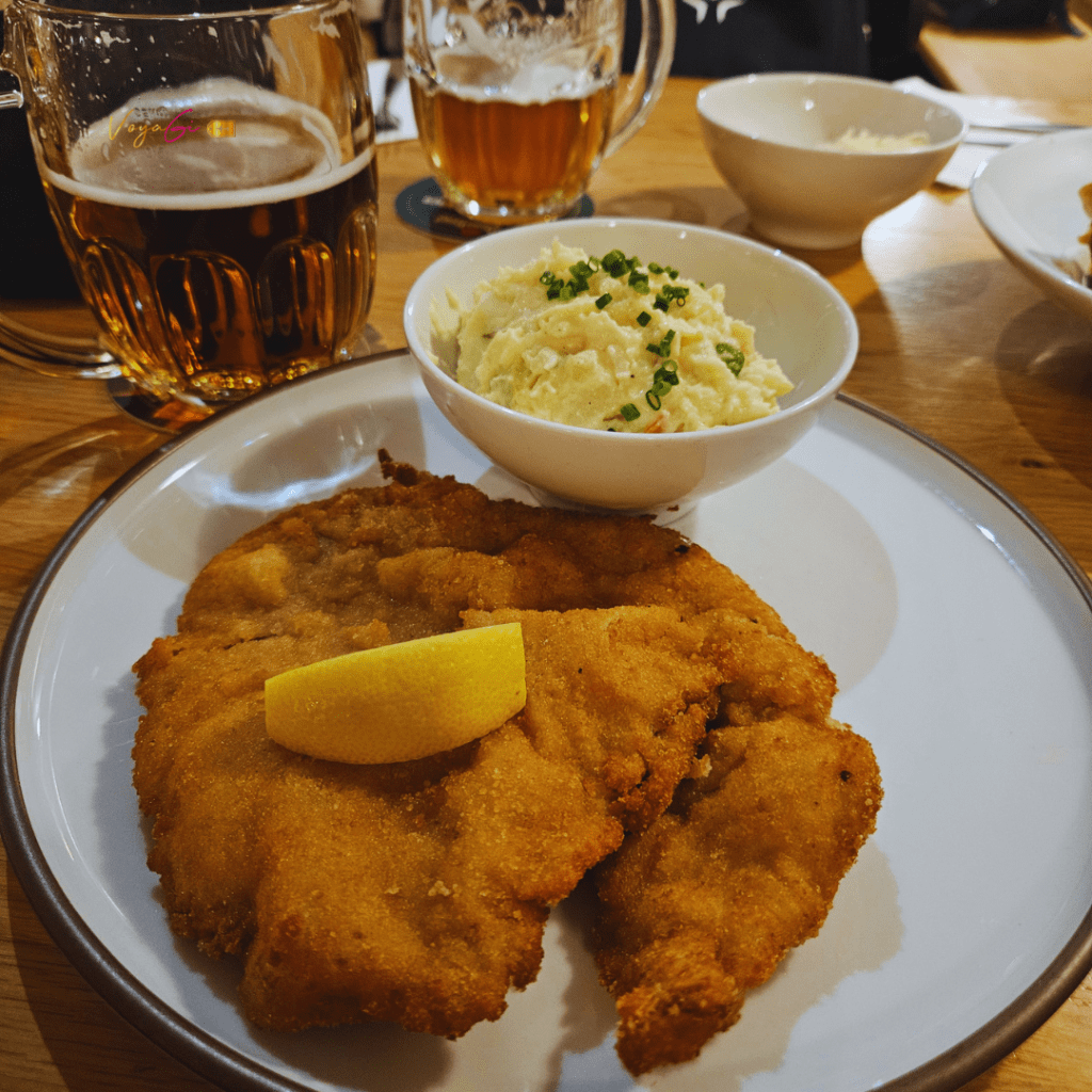 Escolhemos dois pratos tradicionais: o Schnitzel, delicadamente empanado e crocante, e o joelho de porco (Schweinshaxe/Eisbein), que meu marido degustava com entusiasmo em sua busca por descobrir qual país prepara a melhor versão desse clássico.